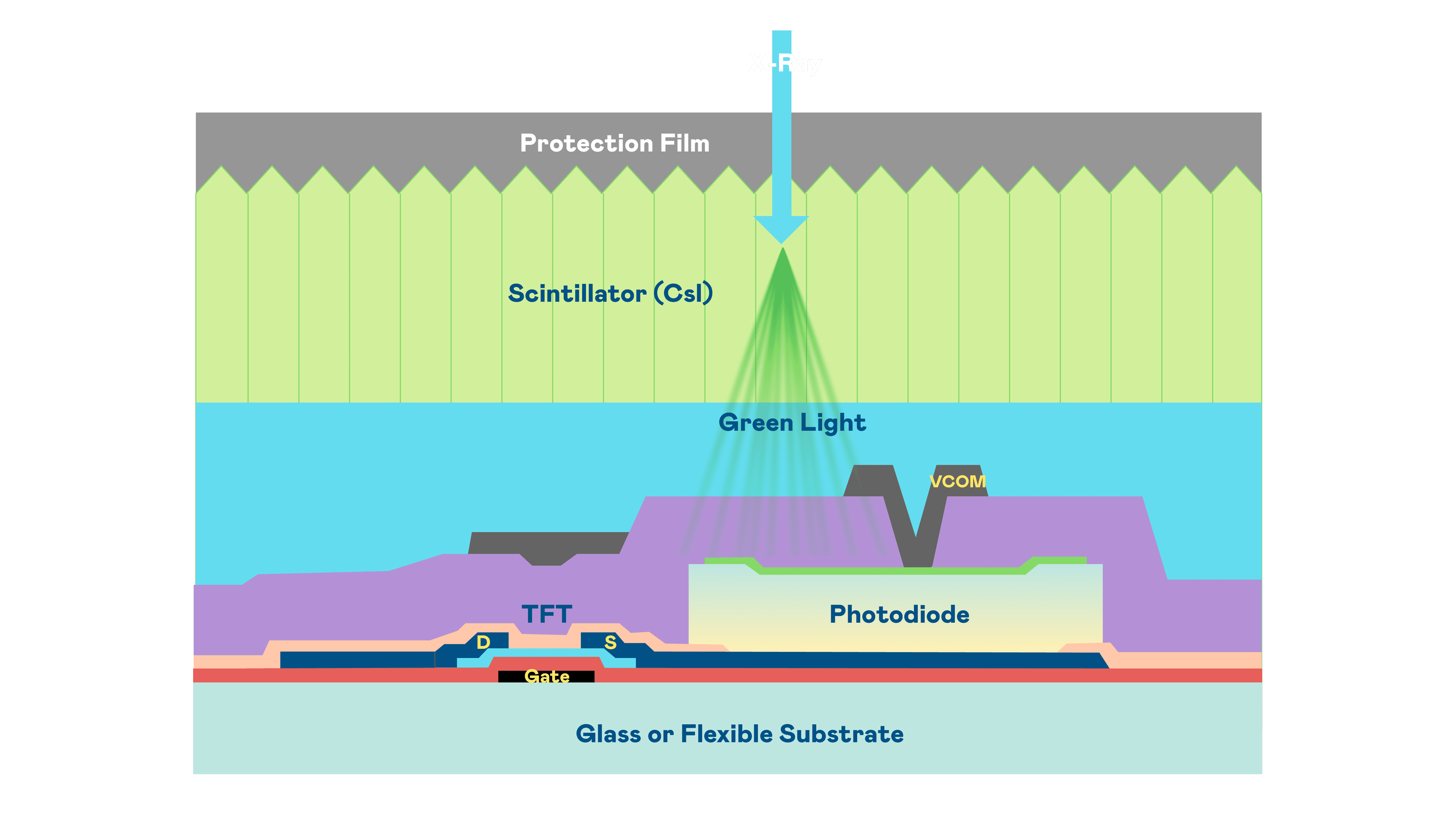 EBpay的X光影像感测阵列使用薄膜电晶体 (TFT) 作为每个像素的读取开关,,搭配光电二极体(Photodiode)的光电转换元件,,,用以感测X光影像讯号。。